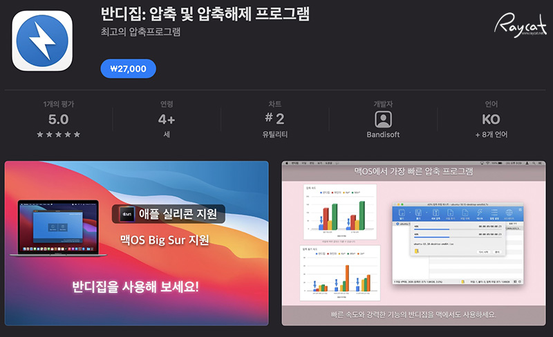 반디집은 맥 앱스토어에서 다운로드 할 수 있으며 가격이 27,000원으로 다소 부담이 될 수도 있는 가격이지만 대부분 압축 포맷을 지원하며 한글 호환성이 무척 좋은 압축해제 프로그램이기도 합니다.