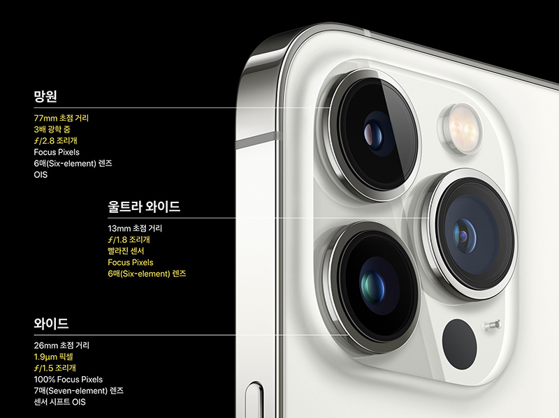 기존 아이폰 12의 망원 카메라가 52mm라 표준화각에 가까웠는데 이번에 망원 카메라가 77mm로 초점거리가 늘어나며 심도 표현이 좀 더 자유로울 것 같습니다.