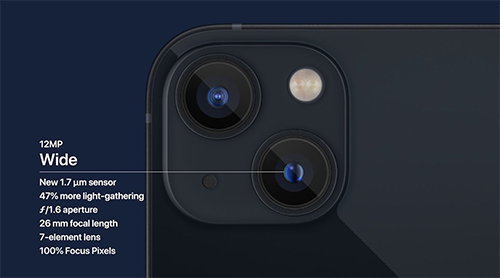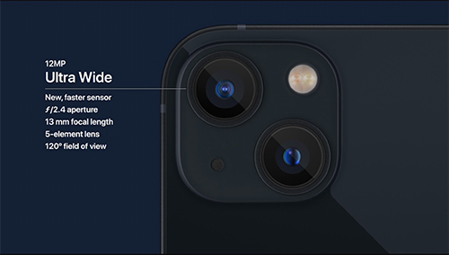 듀얼 카메라에 새로운 센서 시프트 OIS 탑재되었으며 아이폰 13 프로처럼 시네마틱 모드를 지원하고 있으며 프로 시리즈에 추가된 기능인 접사 촬영은 지원하지 않습니다.