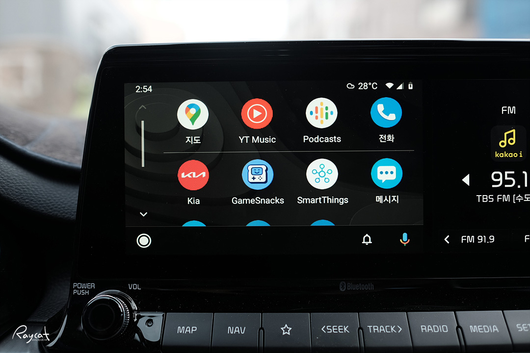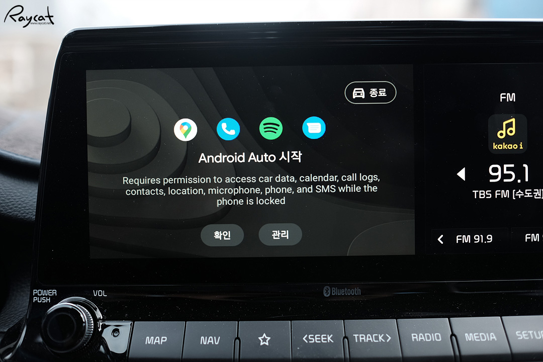스마트폰에서 설정과 권한을 허용해주면 차량 디스플레이에 안드로이드 오토 화면이 나오며 이제부터 네비게이션, 라디오, 뉴스, 메시지, 전화 기능 등을 사용할 수 있습니다. 참고로 네비게이션의 경우 카카오 네비를 갤럭시 Z 플립3에 설치해야 사용할 수 있습니다.