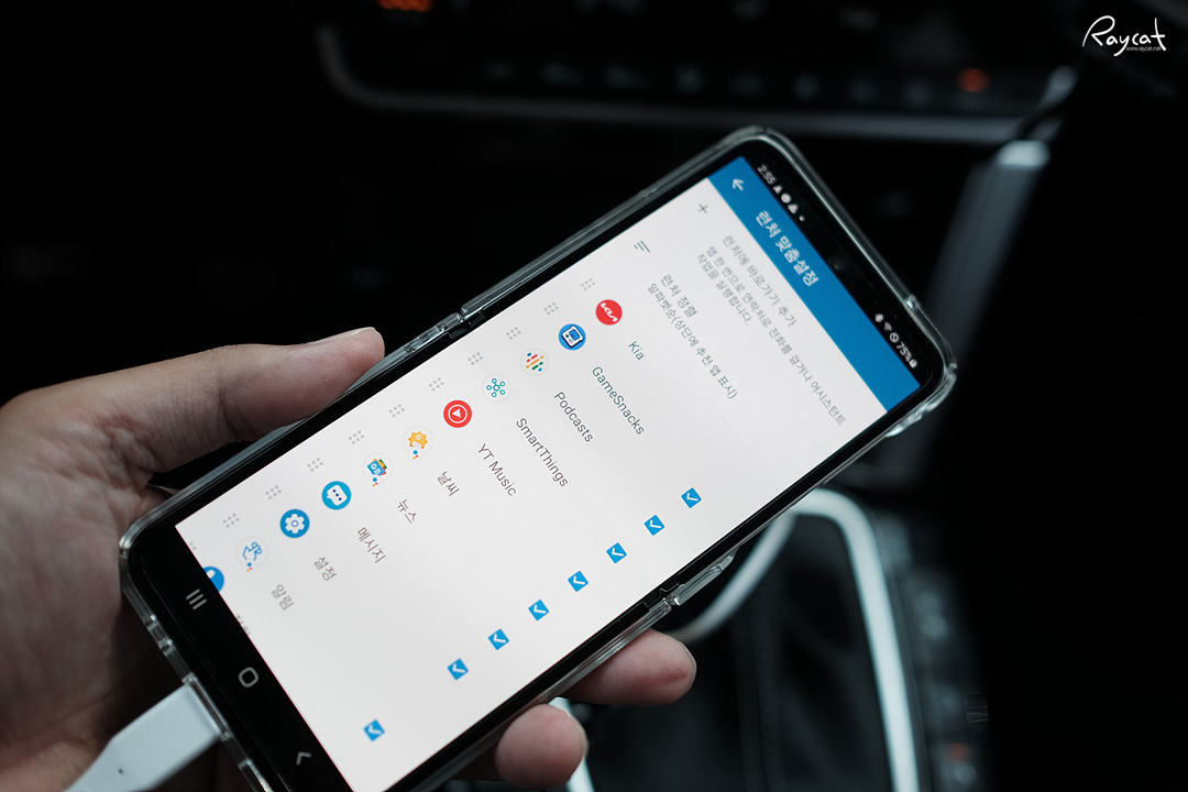 위 사진은 갤럭시 Z 플립에 안드로이드 오토를 켜고 차에 유선으로 연결했을 때 차 디스플레이에서 나오는 화면입니다.