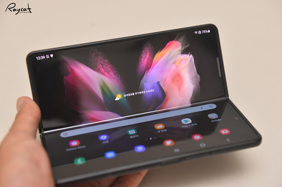 화면을 펼쳐을 때 갤럭시 폴드3의 가장 큰 장점인 7인치의 태블릿을 쓰는 느낌을 주는 화면을 볼 수 있는데 힌지 부분의 주름은 배경화면의 컬러에 따라 잘 보일 때가 안 보일 때가 있습니다.