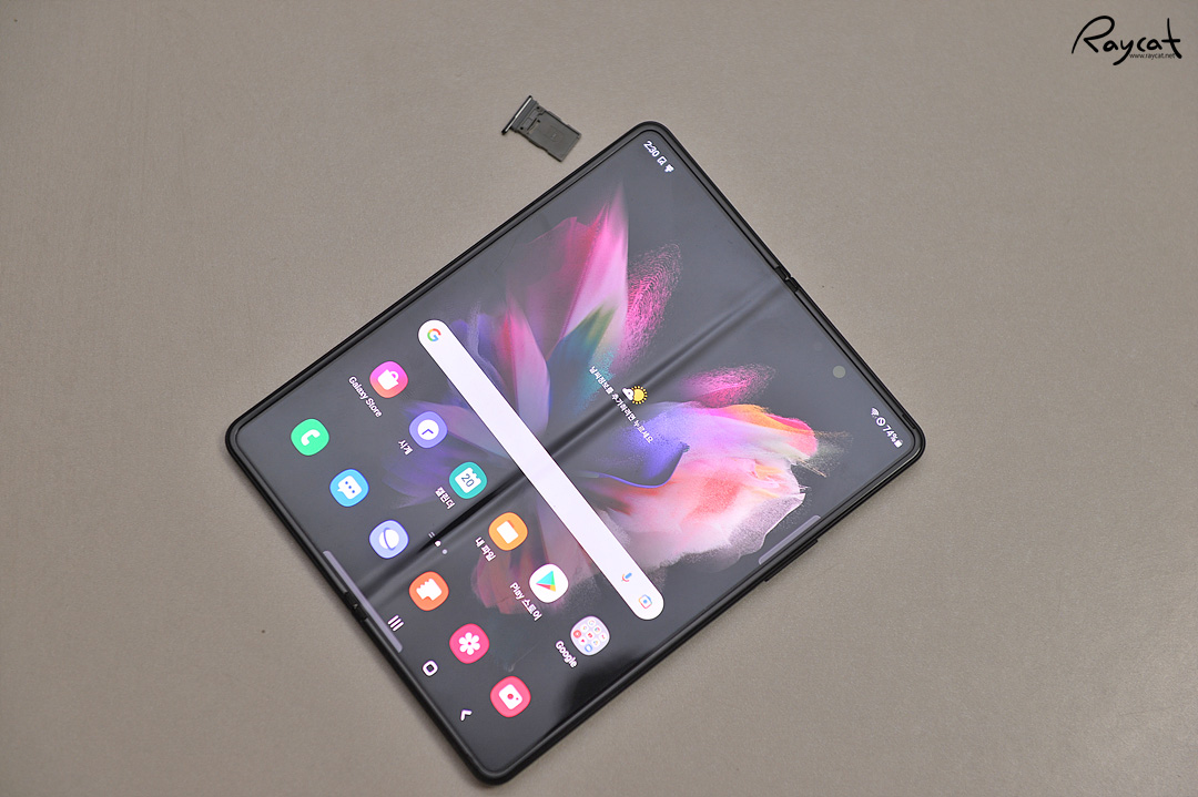 화면을 펼쳐을 때 갤럭시 폴드3의 가장 큰 장점인 7인치의 태블릿을 쓰는 느낌을 주는 화면을 볼 수 있는데 힌지 부분의 주름은 배경화면의 컬러에 따라 잘 보일 때가 안 보일 때가 있습니다.