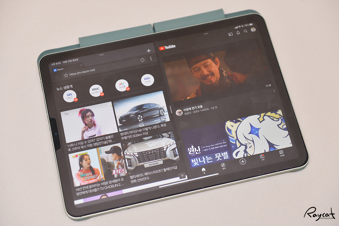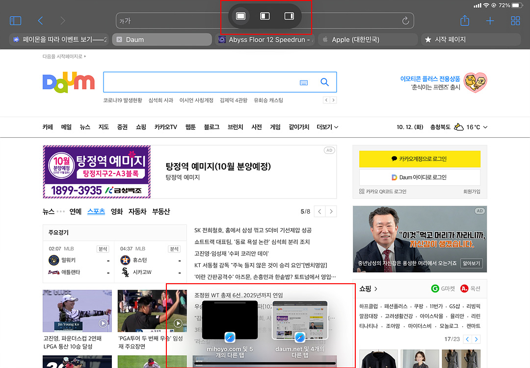 그리고 PIP 기능처럼 앱 위에 실행이 가능한 앱의 경우 브라우저 위에 분리해 실행할 수 있습니다. 손가락 터치 몇 번으로 간단하게 사용자가 아이패드의 화면을 나눠서 쉽게 사용할 수 있도록 되어 있습니다.