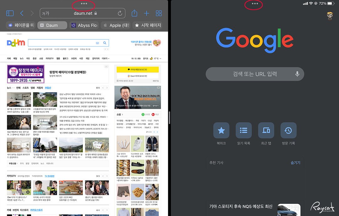 스마트폰의 화면 분할은 작은 화면에서 움직이는 것이라 자주 사용하지 않지만 아이패드의 경우 큰 화면을 활용한 화면 분할 기능은 사용 중에 자주 활용하는 기능 중 하나이고 쉽게 사용할 수 있도록 되어 있습니다.