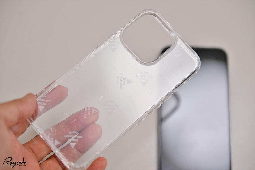 케이스 안쪽과 겉면에 보호 필름이 붙어 있으며 측면은 말랑말랑하고 후면은 딱딱한 소재로 되어 있습니다.
