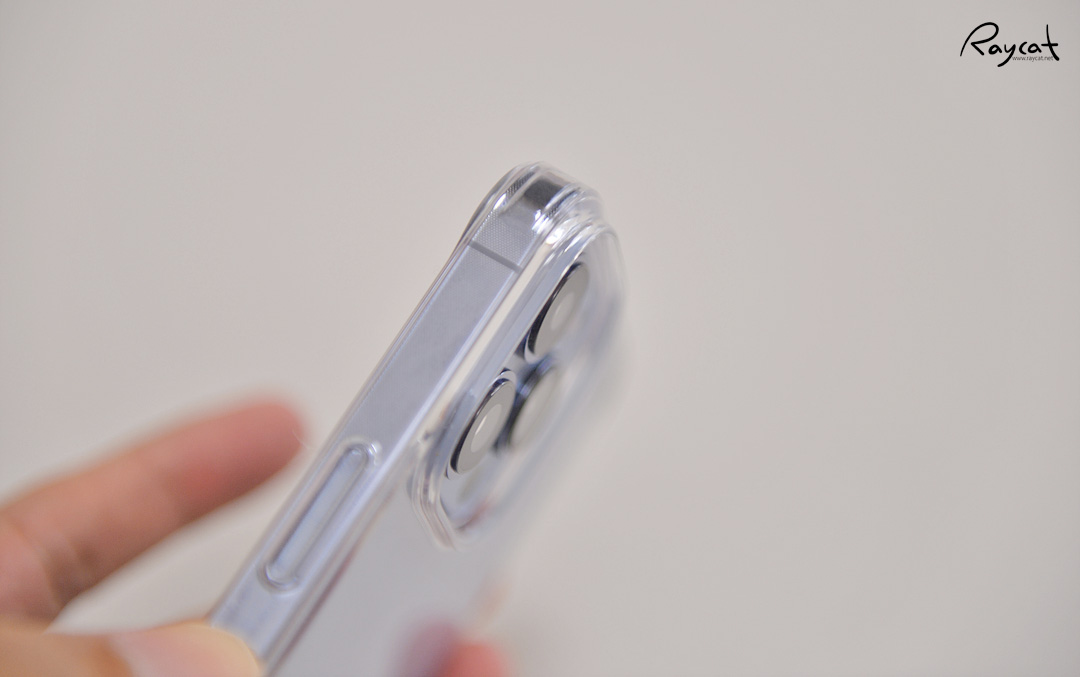링케 케이스의 경우 측면은 모두 말랑말랑한 소재로 되어 있는데 모서리에 에어홀에 있어서 낙하 시 모서리의 충격을 완화해 주는 역할을 합니다. 그리고 이번에 아이폰 13 시리즈의 경우 카메라 센서가 크지면서 카툭튀가 이단으로 되어 있어서 카메라가 실제 아이폰 12와 비교하면 좀 더 올라와 있습니다.