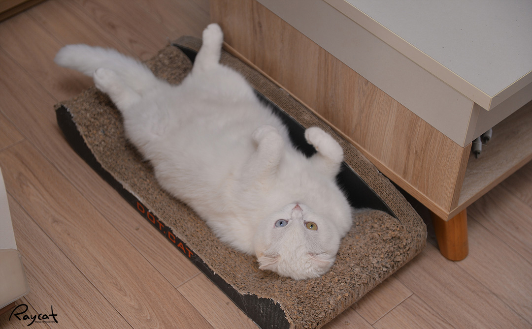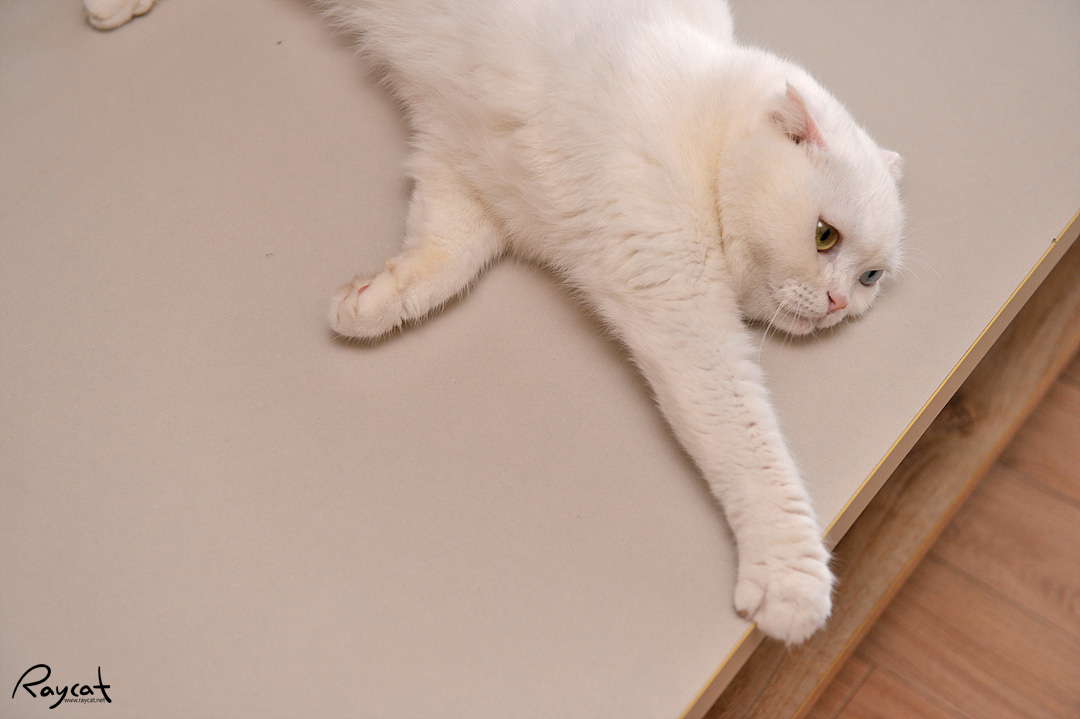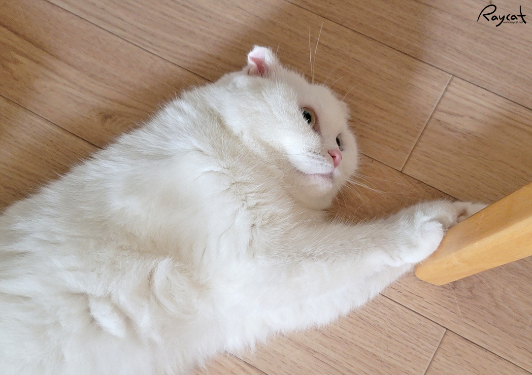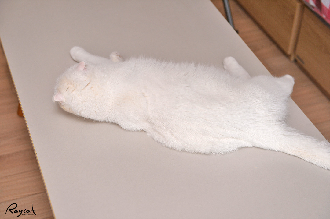 그래서 날씨가 더운 날이면 탁자 위에 드러누워 있는 모습을 자주 볼 수 있다. 밀어낼 때까지 저 위에 잘 누워있는 편인데 저렇게 탁자 위에 누워 있으면 바깥 날씨가 보통 30도 이상으로 더운 날이다.
