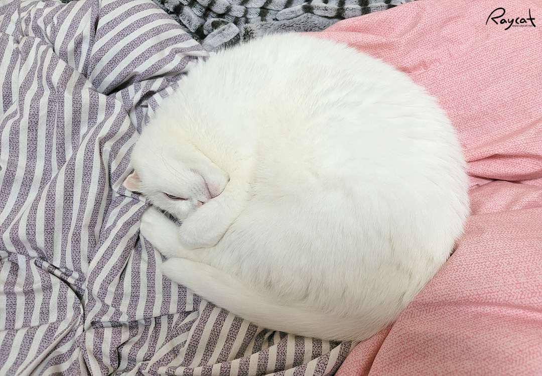 그리고 이제 집사가 잠이 들 시간이면 고양이가 먼저 침대 위에 올라가 잠들어 있다. 꼭 중앙에 저러고 누워 자는데 아직 전기장판을 켜지 않아서 그런지 몸을 말고 잔다.
