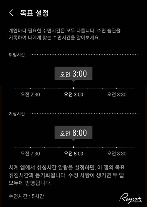 저 같은 경우는 시계를 차고 잠을 잘 못 자는 편이라 수면 측정이 좀 불규칙하게 기록됐는데 스마트폰의 삼성헬스 앱에서 수면 목표를 설정하고 사용하면 시계와 스마트폰이 동기화됩니다.