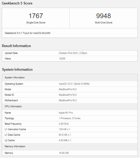 그리고 긱벤치마크 스코어에서 10코어 14인치 맥북프로는 8코어 모델보다 약 20% 빠릅니다.