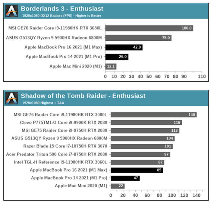 원문의 설명을 보면 로제타에서 돌려서 테스트한 결과라고 하는데 애플 M1 MAX 거의 RTX3060급의 노트북과 비슷한 수준이 되는것 같습니다. 로제타에서 테스트한 결과라 실제 성능은 저것보다 더 높을수 있습니다.