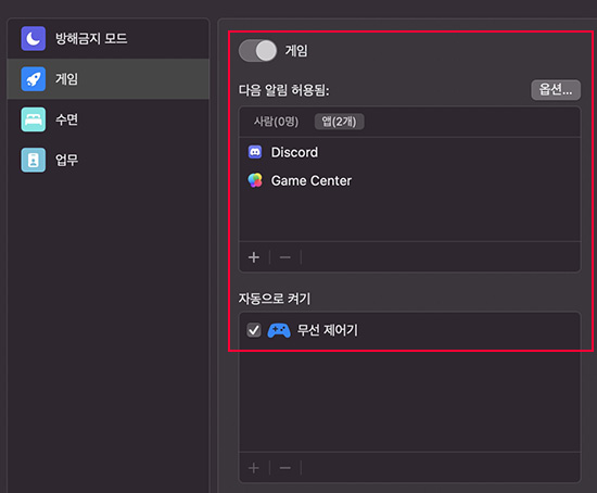 예를 들면 아래 캡처 이미지처럼 게임이란 항목에서 방해를 받지 않는 집중 모드를 사용하고 싶다면 아래처럼 앱을 추가해 주면 됩니다.