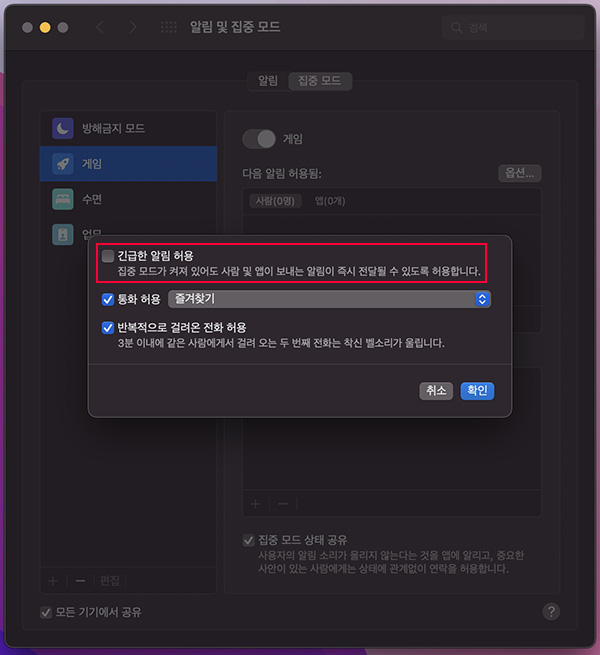 작업 중이라도 꼭 받아야 할 알림이 있다면 받을 수 있도록 '긴급한 알림 허용'에 체크를 하면 됩니다.