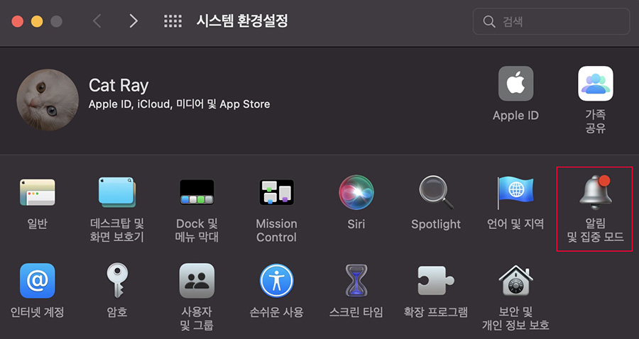 먼저 시스템 환경설정 -> 알림 및 집중 모드를 클릭합니다.