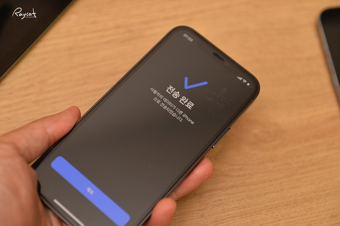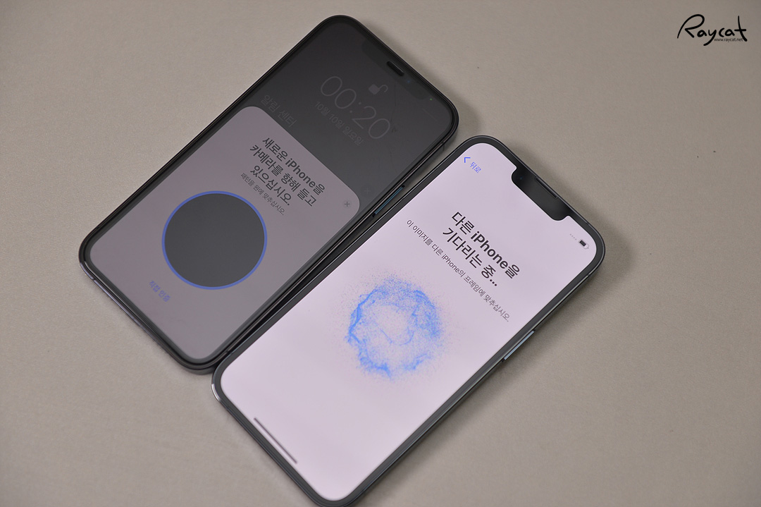 진행을 하면 팝업되는 메세지에 따라 그대로 따라하면 되는데 구형 아이폰의 카메라로 새 아이폰의 화면에 나오는 원형을 맞춰 촬영하면 바로 데이터 이전을 시작하게 됩니다.