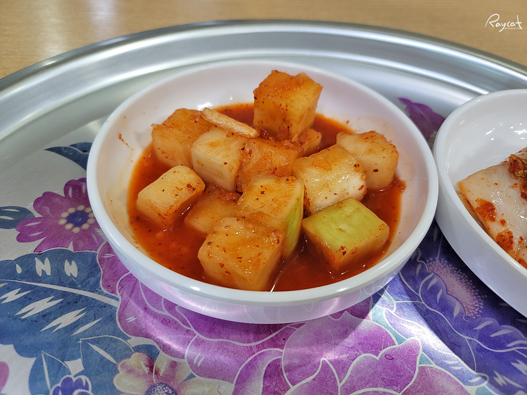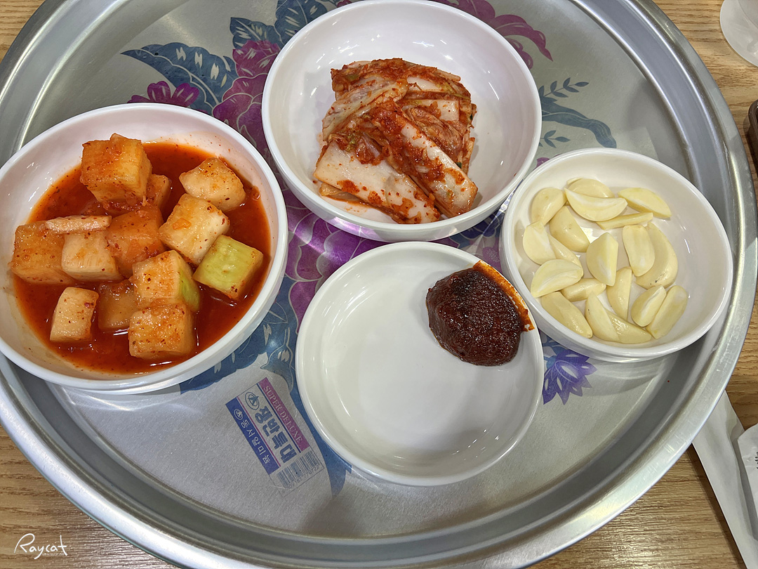 수요일은 갈비탕만 주문이 가능하며 자리에 앉으면 바로 깍두기와 김치, 마늘, 양념장을 가져다 준다.