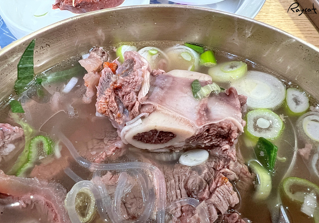 고기가 부드럽고 꽤 맛있는데 양념장에 마늘과 찍어 먹으면 심심한 맛이 덜한데 개인적으로 와사비 간장이 있으면 더 좋을 것 같다는 생각이 든다. 일반 갈비탕에 갈비 2~3대 들어있는 것과 다르게 고기가 정말 많아서 고기를 다 먹고 밥을 말아먹는데 밥까지 혼자 먹기는 어른한테도 양이 많은 편이다.