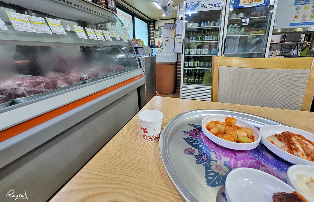 내부는 흔히 보통 동네에서 볼 수 있는 일반 정육식당과 비슷하다. 정육식당이라 생고기를 고를수 있는 냉장고가 있고 안쪽에 방이 있고 식당 내부에 테이블이 다닥다닥 붙어있다. (수요일 점심에 와서 손님이 많아서 식당 내부는 찍기 어려웠다.)