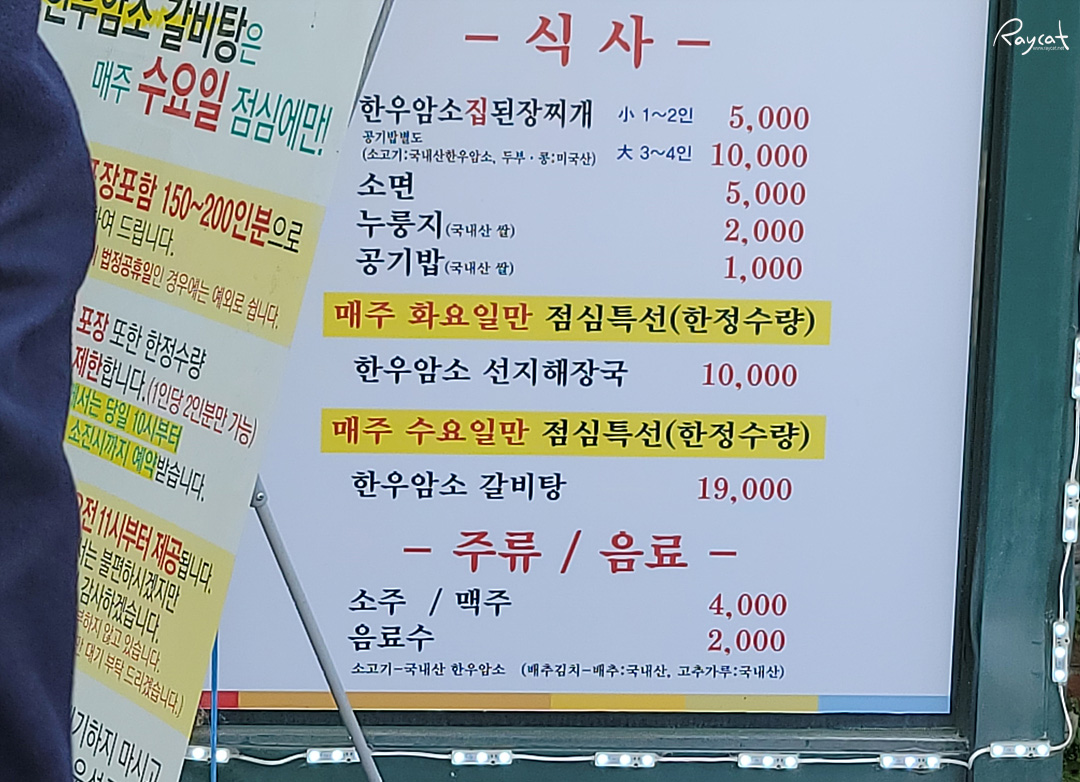 매주 화요일과, 수요일 점심에만 한정수량으로 한우암소 선지해장국, 한우암소 갈비탕을 판매하고 있는데 갈비탕이 19,000원이라 갈비탕치고 가격은 저렴하지 않은데 예전에 허영만의 백반 기행에도 소개된 집이다.