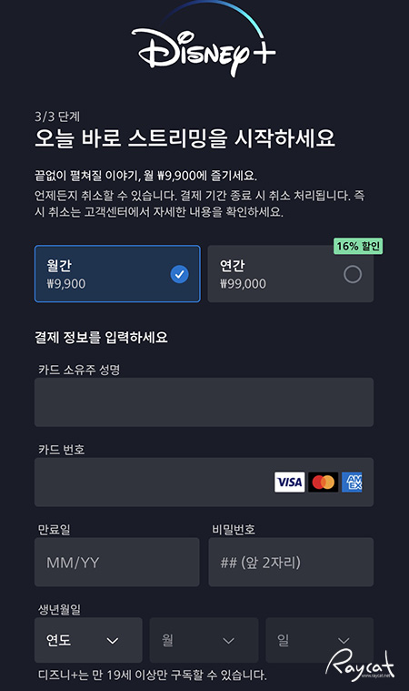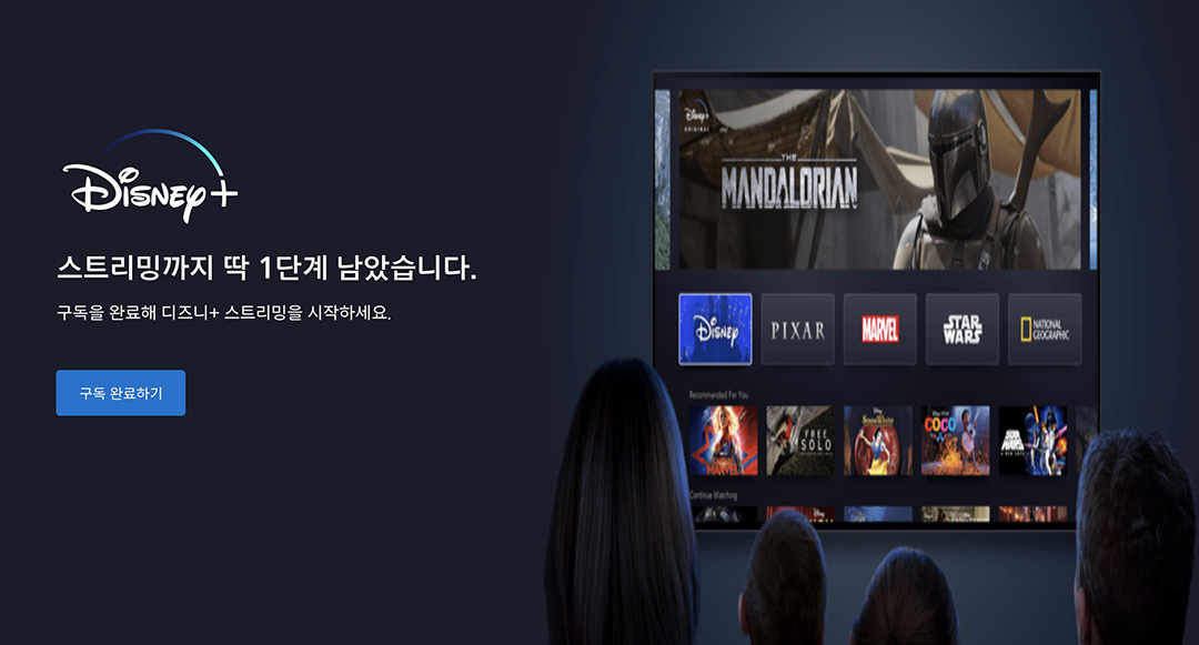 참고로 넷플릭스가 처음 서비스할 때 맛보기 서비스가 있었는데 디즈니플러스는 맛보기 서비스 없이 일단 결제를 해야 서비스를 이용할 수 있습니다. 그래서 일단 한 달 결제를 했습니다.