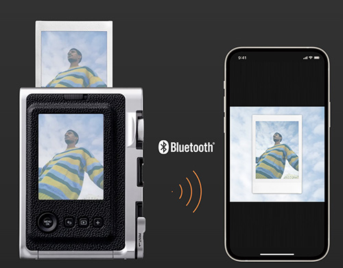 스마트폰과 블루투스로 연결하며 인스탁스 미니 에보로 촬영한 사진을 스마트폰으로 보내거나 스마트폰으로 촬영한 사진을 인스탁스 미니 에보로 출력할 수 있습니다.
