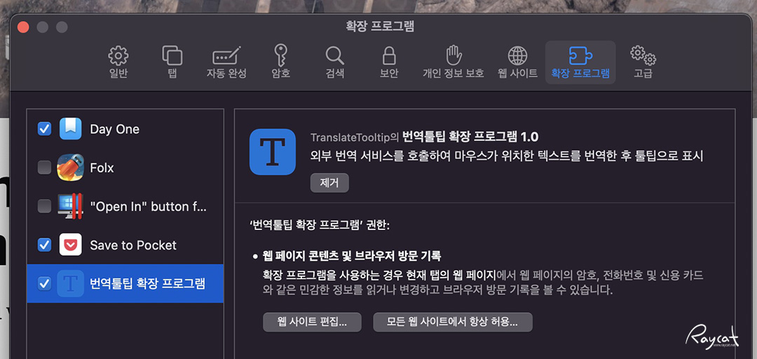 사파리 확장 프로그램으로 자동 등록이 되면 '모든 웹 사이트에서 항상 허용'을 하면 모든 웹페이지에서 트랜스레이트 툴팁으로 번역 기능을 사용할 수 있습니다.