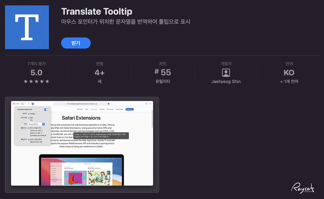 트랜스레이트 툴팁은 사파리 확장 프로그램으로 다국어 번역기로 기본 번역 프로그램은 구글번역을 사용하고 있습니다.