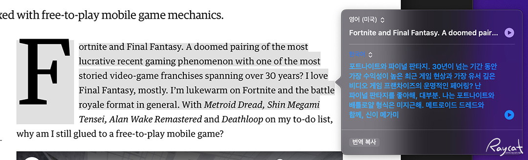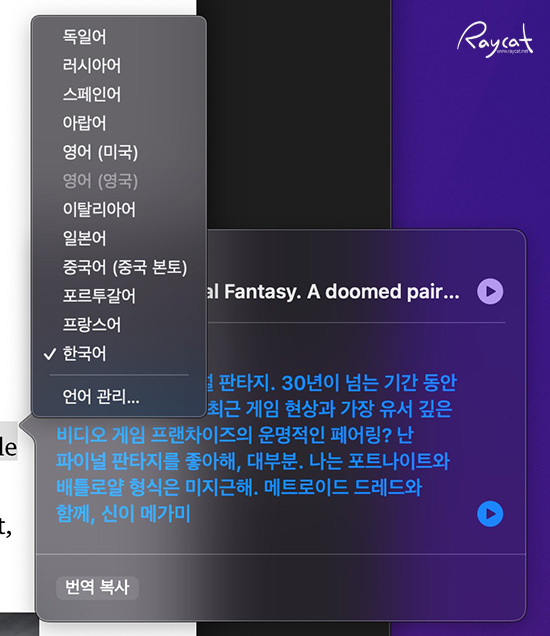 영어권외에도 다양한 언어를 지원하고 있어서 맥 사용자중 사파리에서 마우스를 가져다대면 바로 번역이 가능하기 때문에 편리하게 사용할 수 있습니다.