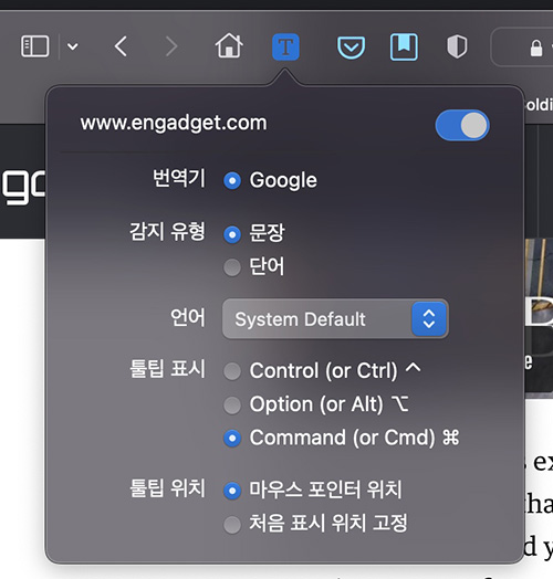 사파리 확장 프로그램에 자동으로 등록되며 사파리 상단의 메뉴에 트랜스레이트툴팁 메뉴가 생성됩니다.