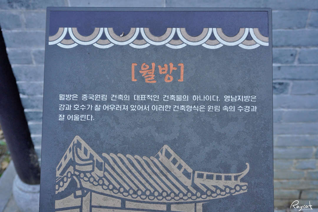 중국원림 건축의 대표적인 건축물인 월방도 구현되어 있으며 우리 전통 가옥과 확실히 중국의 건축물의 차이를 느낄수 있다.
