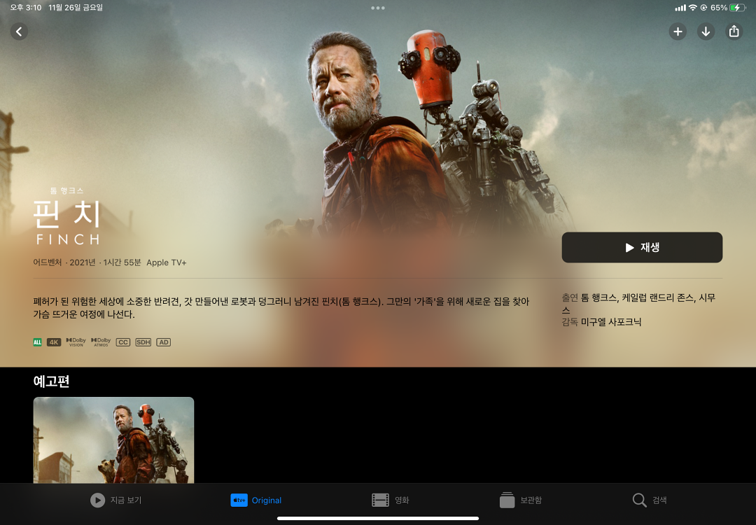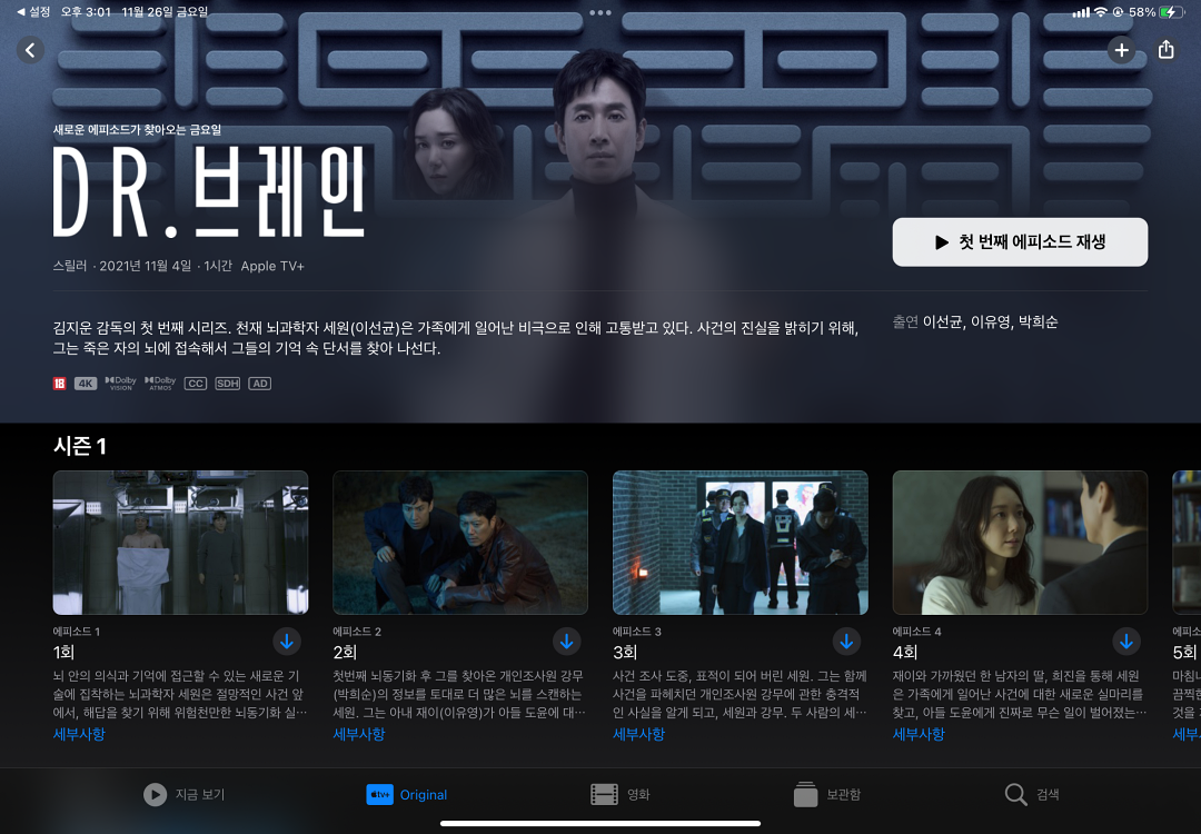 애플 오리지널 콘텐츠중에 드라마 DR 브레인과 영화 핀치는 꽤 재미있게 본 것 같은데 아직 애플 오리지널 콘텐츠 종류가 많지 않습니다.