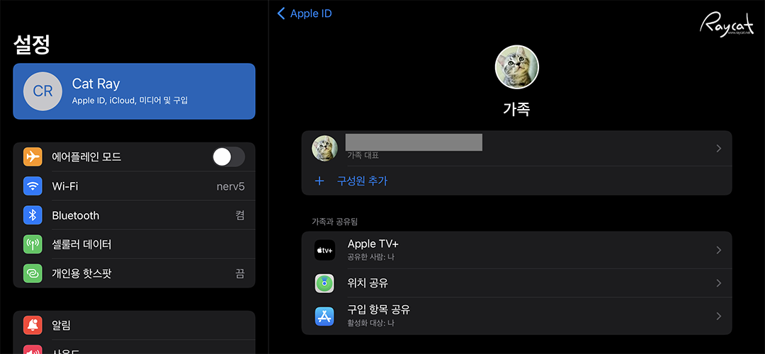 본인 이름을 탭한 후 '가족 공유'를 탭 합니다. '가족 설정'을 탭한 후 화면의 안내에 따라 가족 구성원을 초대하면 됩니다.