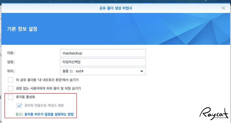 공유 폴더 생성 마법사를 사용하면 편한데 이름을 생성해주고 '휴지통 활성화'는 체크를 하면 안 됩니다. 맥 타임머신 폴더는 휴지통이 필요 없기 때문에 휴지통은 비활성화가 되어 있어야 합니다.