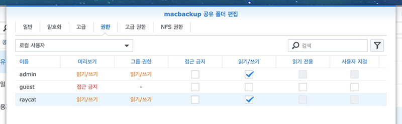 이 과정이 끝나면 시놀로지 NAS에서 맥 타임머신 백업을 위한 공유 폴더는 준비가 끝난 셈입니다.