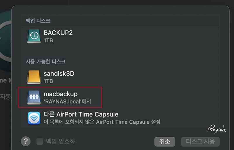 백업 디스크를 나스에서 만든 공유 폴더를 선택하고 '디스크 사용'을 누르고 맥 OS의 데이터를 나스로 백업하면 됩니다.
