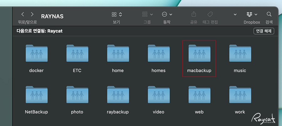 제경우 생성된 공유 폴더가 많은데 데이터를 모두 NAS에 보관하고 있어서 공유 폴더를 목적에 따라 나눠뒀기 때문인데 방금 만든 백업 폴더를 열어보면 맥에 NAS에서 만든 백업 폴더가 추가됩니다.