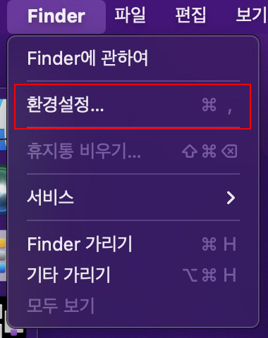 파인더(Finder)에서 환경설정을 누르면 바로 환경설정으로 들어가 파인더(Finder)를 설정 할 수 있습니다.