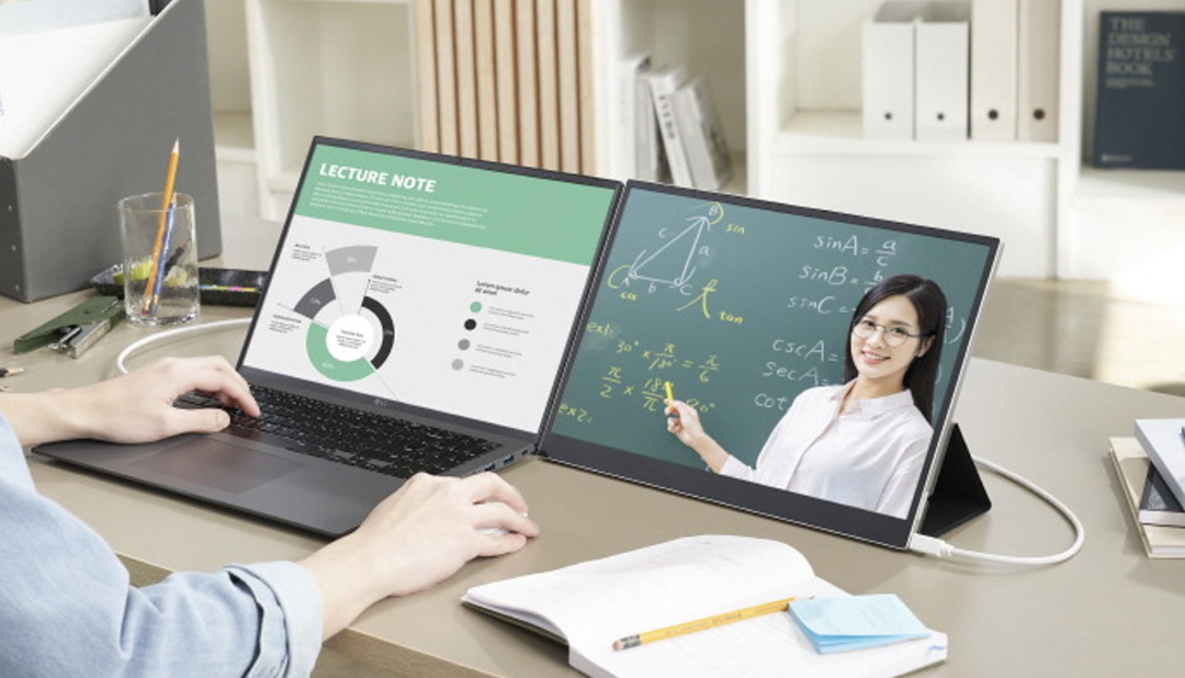 뷰(VIEW)는 노트북과 함께 휴대할 수 있는 디스플레이로 노트북을 위한 확장형 디스플레이로 화면을 공유하고 노트북 화면을 확장해 듀얼 모니터를 사용하듯이 사용할 수 있습니다.