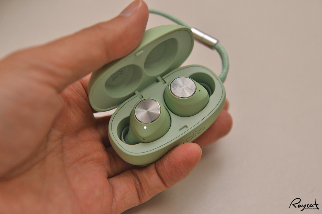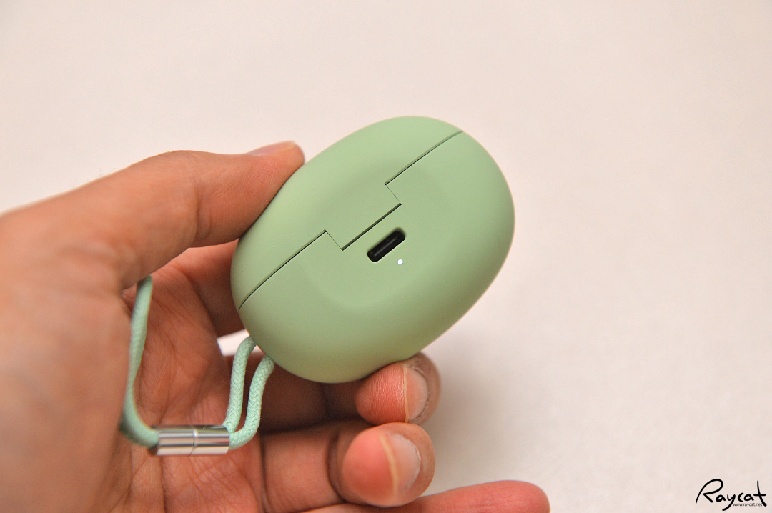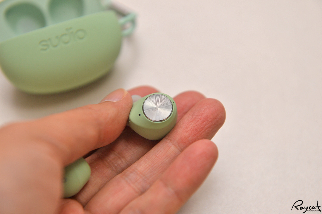 충전 케이스가 조약돌처럼 한 손에 쏙 들어오는 크기로 현재 사진에 보이는 수디오 T2의 컬러는 JADE 컬러로 옅은 그린 컬러로 케이스 후면에 USB-C 충전 포트 그리고 충전 상태를 보여주는 led가 있습니다.