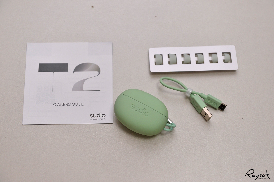 기본 구성품은 수디오 T2 이어버드와 케이스, USB-C 충전 케이블, 이어팁, 사용 설명서가 있습니다.