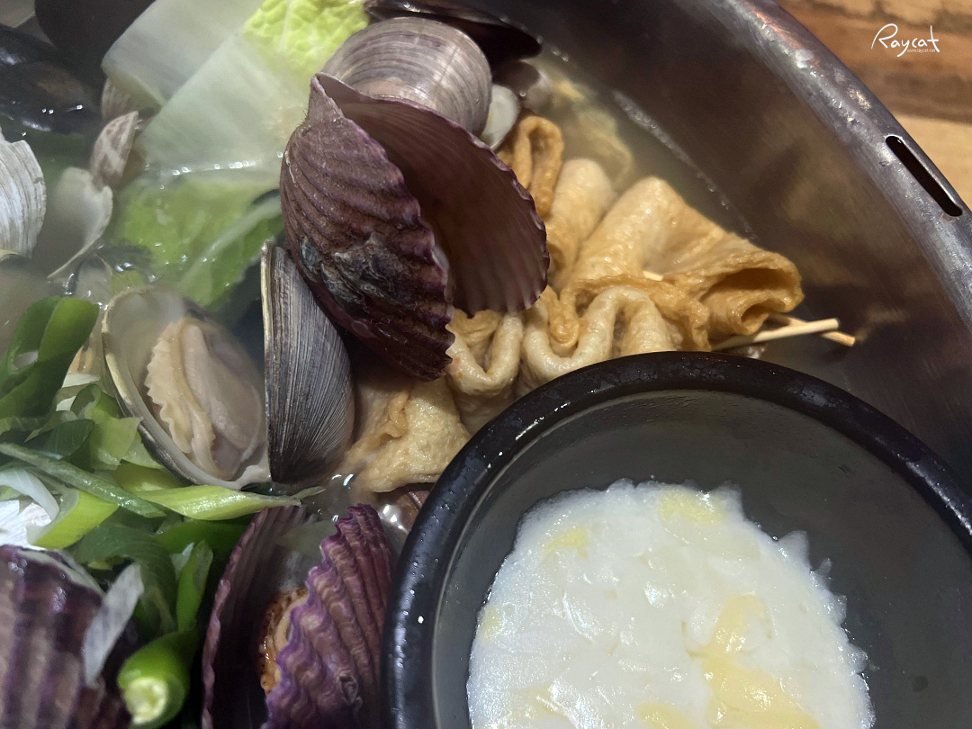 조개전골을 주문하면 커다란 솥에 조개와 다른 해산물이 담겨져 나오는데 이제 삶아지기를 기다리면 됩니다. 사이드 메뉴로 추가할 수 있는 사리가 많아서 조개전골을 먹다가 만두, 라면, 칼국수, 라면, 매생이등을 추가할 수 있습니다.
