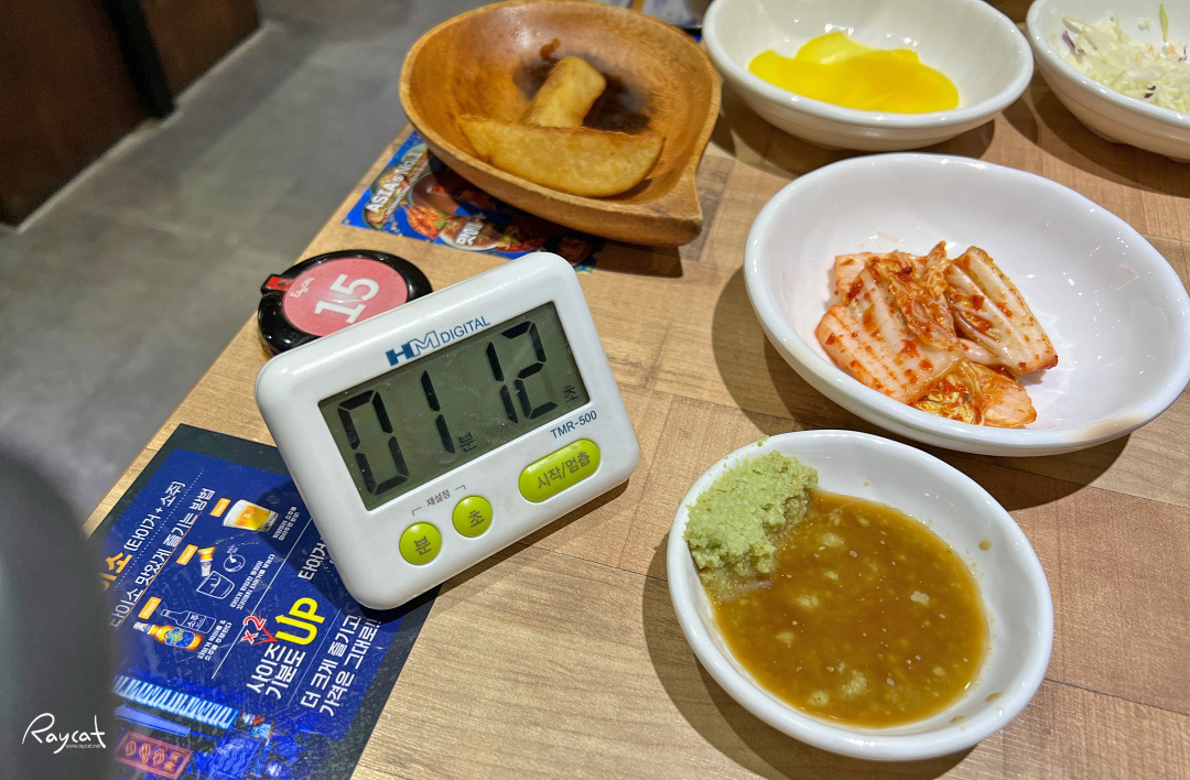 조개전골과 함께 타이머를 테이블에 놓고 가는데 다른 밑반찬은 셀프바를 이용할 수 있습니다.