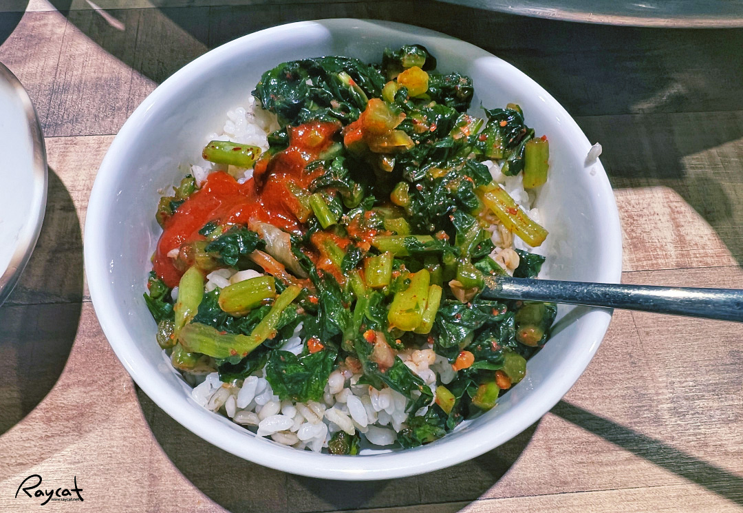 열무비빔 보리밥은 사이드 메뉴지만 꽤 맛있고 조개전골을 주문하면 셀프바에서 무료 제공이라 조개전골만 주문하고 가볍게 식사할 수 있는 메뉴중 하나입니다.