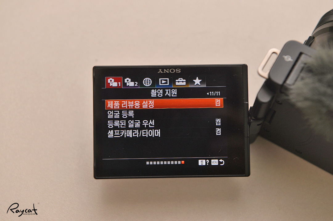 동영상 기능에 제품 리뷰용 설정을 해두면 제품 리뷰 촬영 시 카메라 렌즈 앞으로 손에 든 제품을 내밀면 포커스 전환되며 바로 제품에 초점을 맞추며 뒤쪽은 아웃포커스 효과가 적용됩니다.