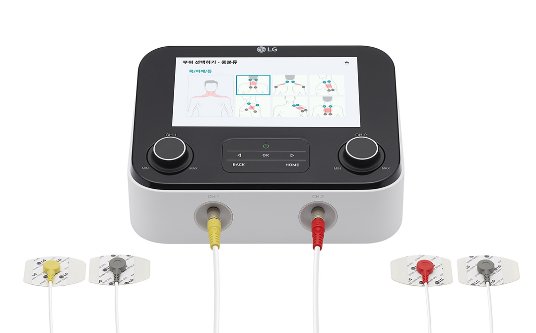LG 메디페인은 위 사진에 보듯 각티슈만한 크기의 본체와 전극패드 4개로 구성되어 있으며 사용자는 본체 중앙에 있는 7인치 LCD 화면에 출력되는 이미지와 음성 안내에 따라 목, 어깨, 무릎 등 통증 완화를 원하는 부위의 주변부에 패드를 붙이고 하루 30분씩 10일간 원하는 강도에 맞춰 사용하게 됩니다.