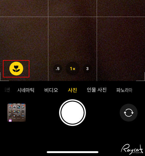 아이폰 13 프로의 카메라가 피사체에 근접하게 되면 위 캡처 이미지처럼 매크로 마크가 표시됩니다.
