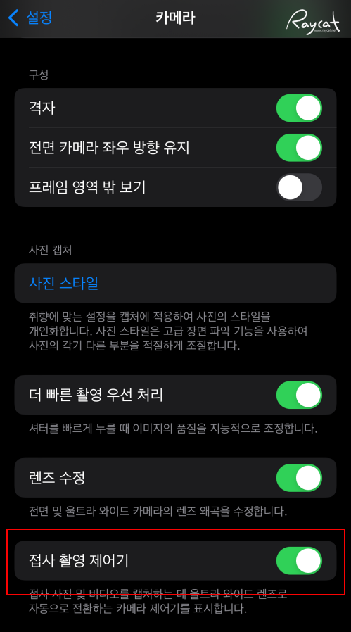 그리고 아이폰 설정 -> 카메라 -> 접사 촬영 제어기를 ON 해두면 아이폰13 프로를 사용해 접사 사진을 촬영할 준비가 끝난셈 입니다.