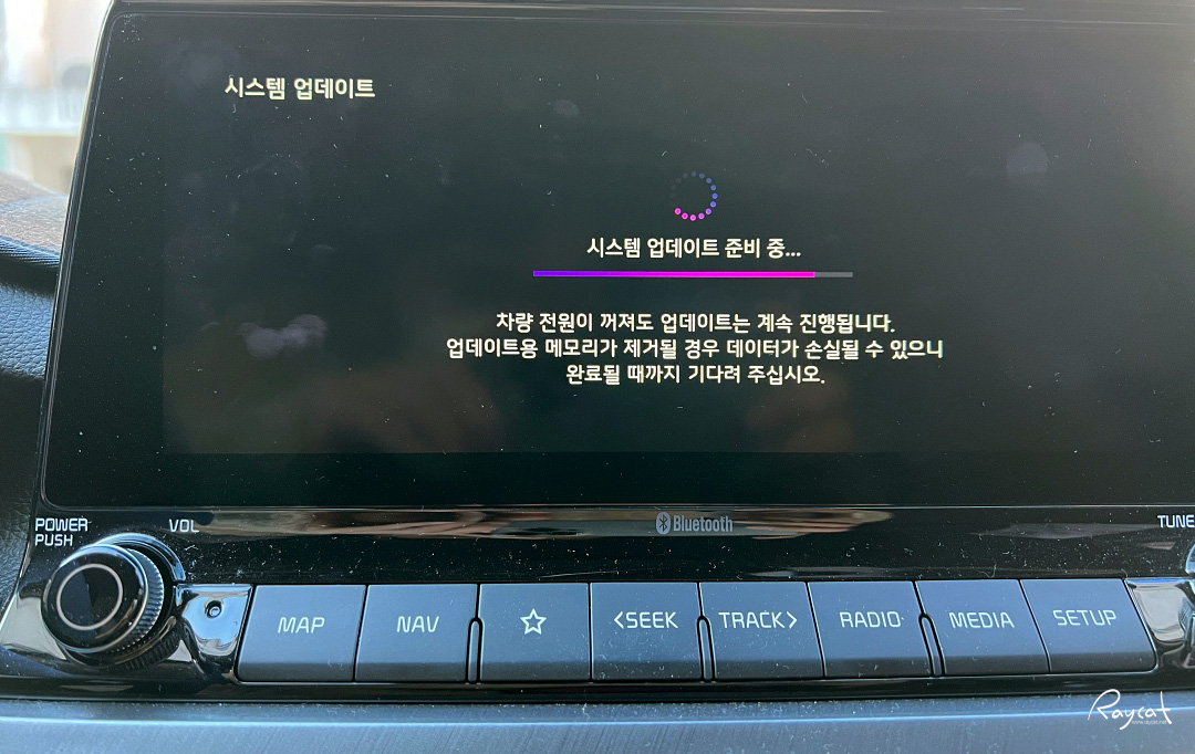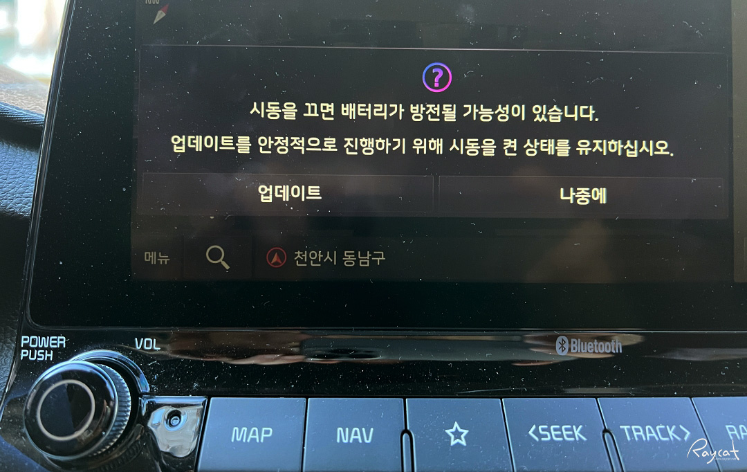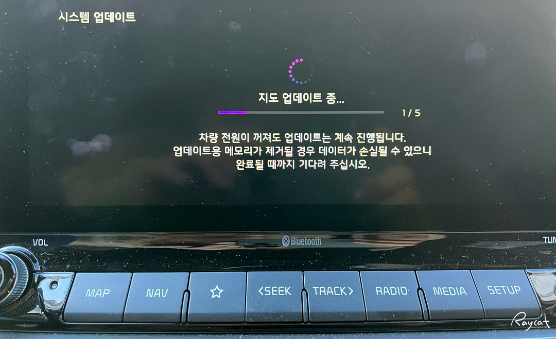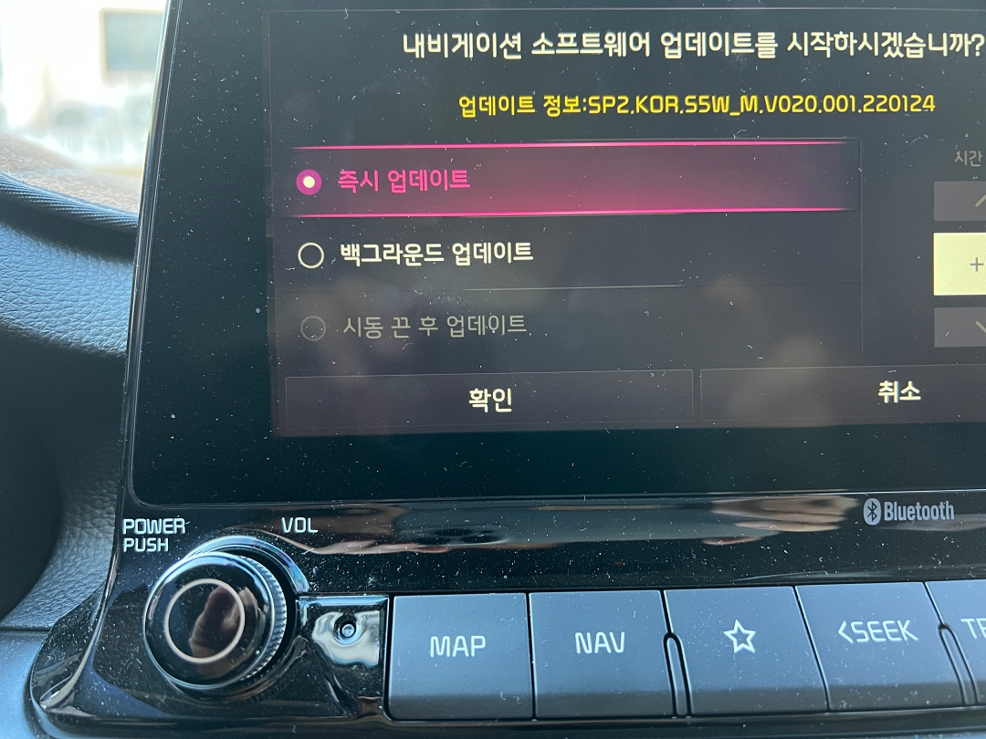 USB 메모리를 연결하고 시동을 켜면 네비게이션 디스플레이에 바로 팝업창이 나오며 업데이트를 시작할지를 묻게 되는데 데이터가 많은 경우 시간이 30분 정도 소요되니 시동을 계속 켜 두어야 하기 때문에 시간의 여유가 있을 때 하시길 권합니다.