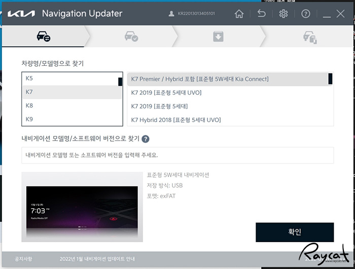 다운로드한 네비게이션 업데이트 애플리케이션을 실행하고 로그인하면 차량 선택 화면이 나옵니다. 이제 차량을 선택하고 확인을 누르면 바로 다운로드로 넘어갑니다.